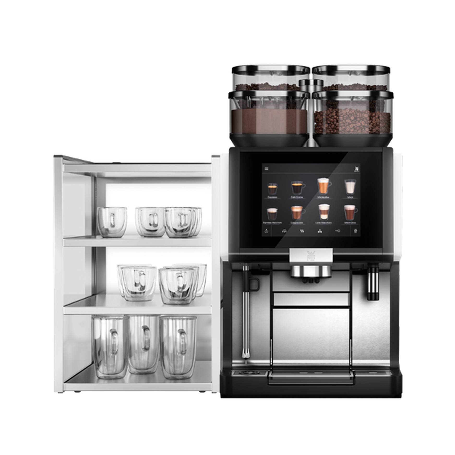 Jedes Gerät ist entsprechend in Design und Leistung auf unsere Kaffeemaschinen abgestimmt - sowohl technisch als auch optisch harmonieren sie perfekt miteinander. Wählen Sie eine Kombination, um Ihr Kaffeeangebot zu vervollständigen. Zum Beispiel: Ergänzen Sie einen Tassenschrank auf der einen und einen Milchkühler auf der anderen Seite.
