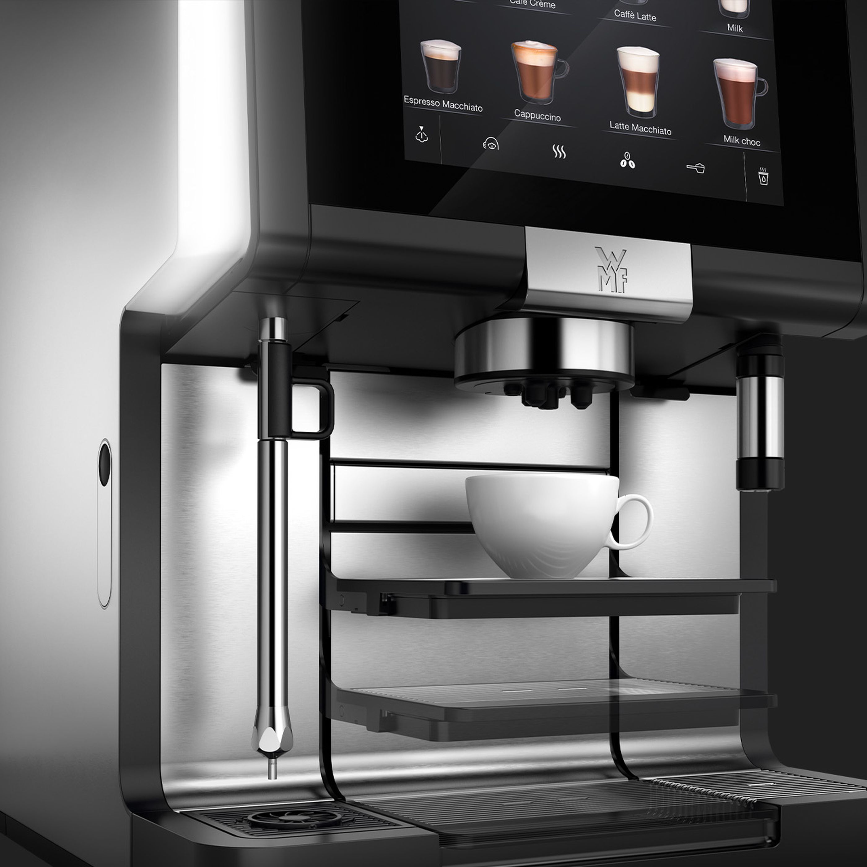 Siatka stolika na filiżanki automatycznie przesuwa się w górę w kierunku stałej wylewki w zależności od napoju i ustawienia, zapewniając idealny prześwit dla każdego rodzaju filiżanki. Dzięki temu temperatura napoju pozostaje idealna, a nieestetyczne rozpryski mleka są wyeliminowane.
